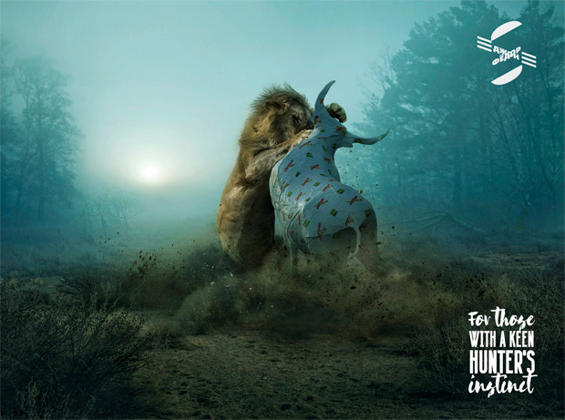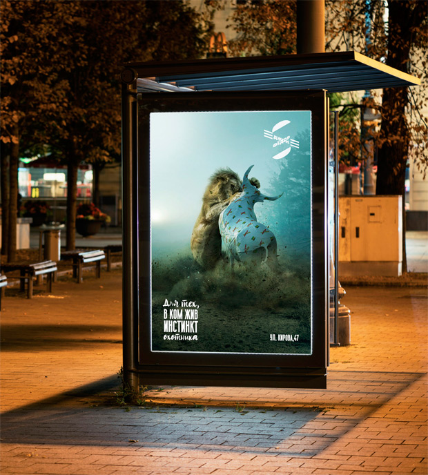 Для тех, в ком жив инстинкт охотника». Для визуалов агентство создало динамичные зарисовки: лев охотится на быка, завернутого в бумагу с уже ставшим известным логотипом разработки студии Артемия Лебедева.
