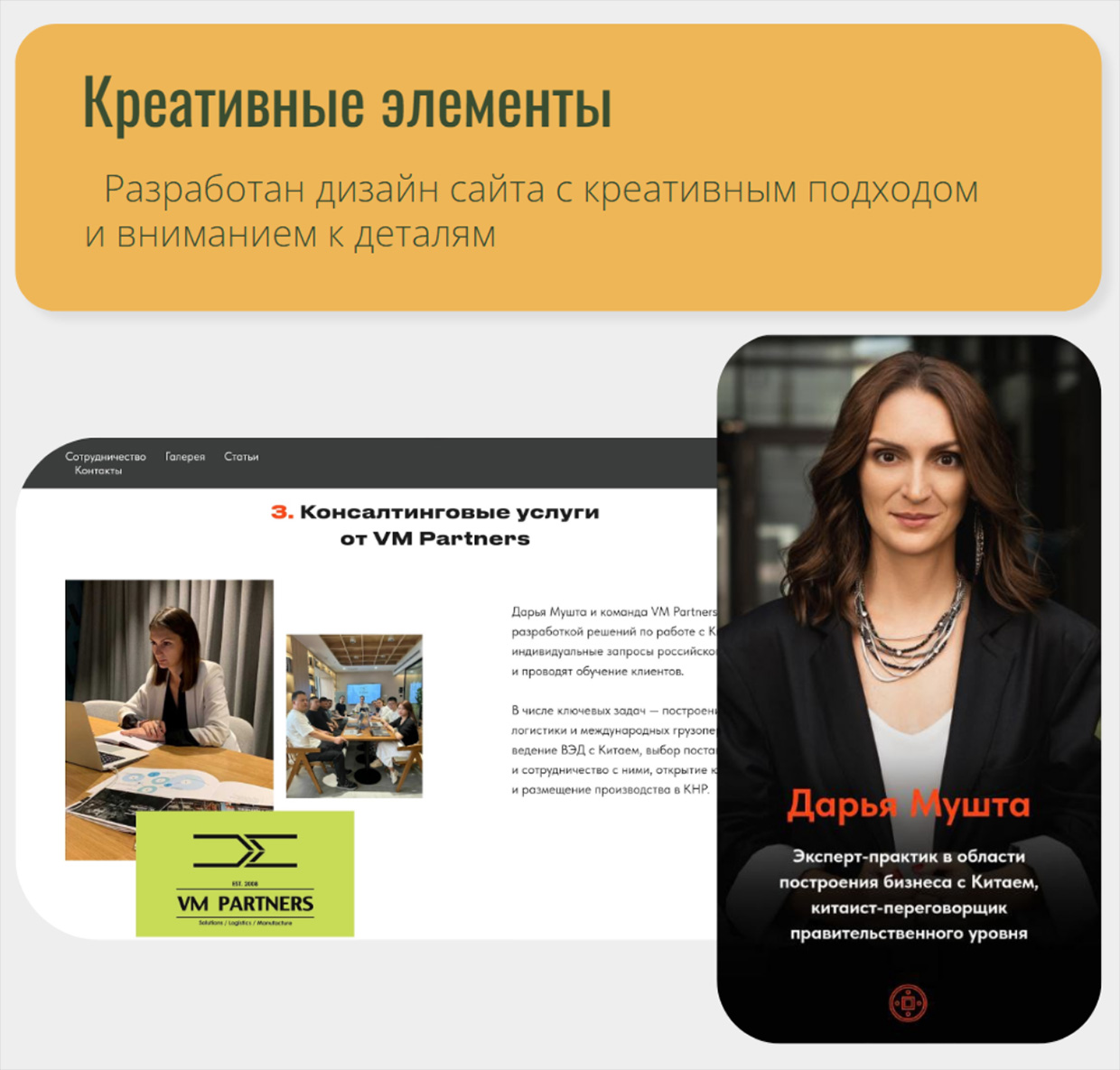 Команда проекта доработала сайт с креативным дизайном и структурировала всю информацию о Дарье: биография, компетенции, кейсы, услуги. Важнейшей частью стала SEO-оптимизация, чтобы по её имени и ключевым запросам, связанным с Китаем, сайт выходил на первые позиции.