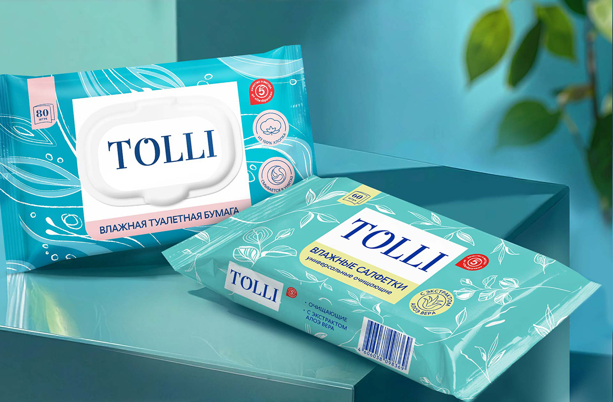 Брендинговое агентство Uprise обновило дизайн упаковки серии гигиенических товаров под брендом Tolli для сети магазинов «Пятёрочка».
