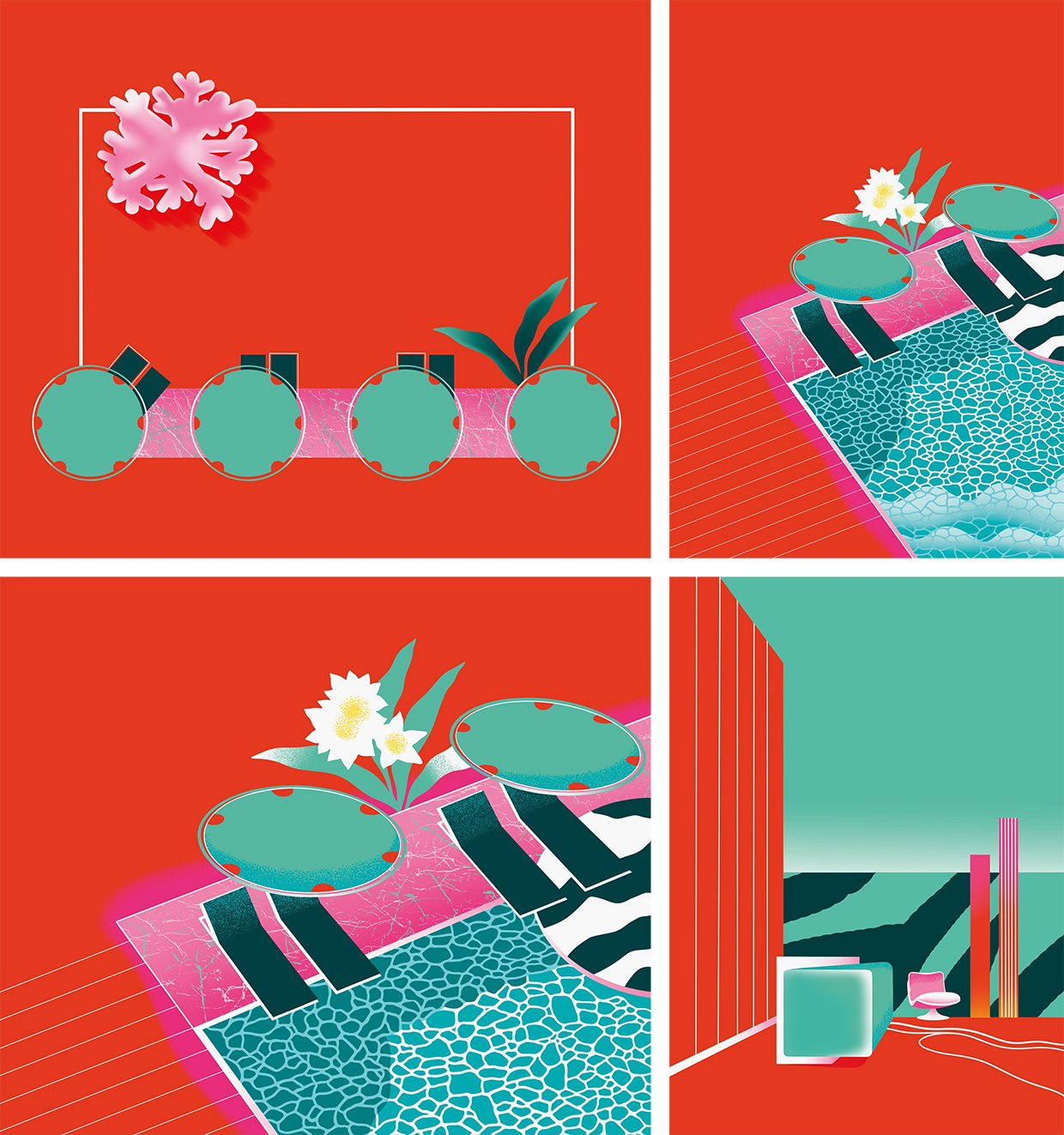 - Графическая система. Минималистичные иллюстрации ключевых пространств и паттерн сформировали гибкую систему для разных носителей — от полиграфии до выставочных стендов.