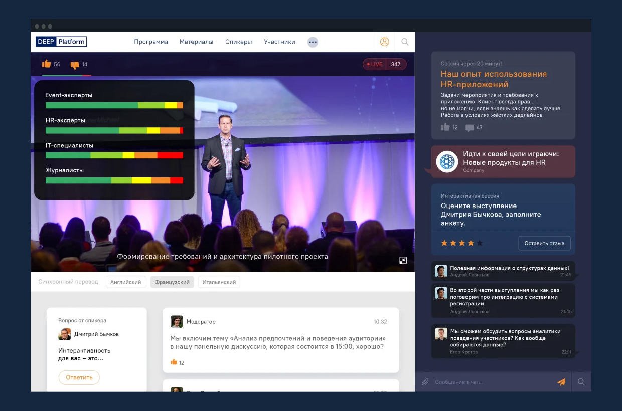 DEEP Platform — полнофункциональная и настраиваемая система для автоматизации процессов любого типа мероприятий (онлайн и оффлайн): трансляции и видеовстречи, персональные профили участников, встроенные мультимедийные и интерактивные блоки, любой видеоконтент и презентации, чат и опросы, а также удо
