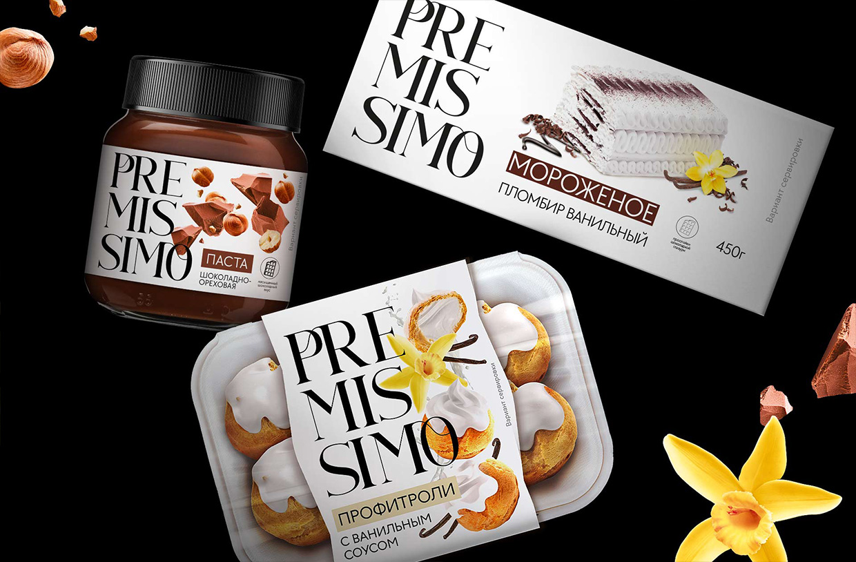 Брендинговое агентство UPRISE разработало для торговой сети «Пятёрочка» оформление упаковки для серии премиальной продукции под новым брендом PREMISSIMO.