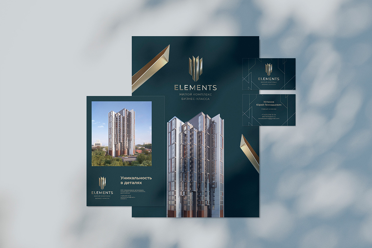 Благодаря созданному логотипу и фирменному стилю жилой комплекс «Elements» получил выразительный и современный визуальный образ. Он подчёркивает статусность проекта, выделяет его среди конкурентов и помогает формировать у аудитории ассоциации с высоким качеством, надёжностью и инновациями в строительстве.